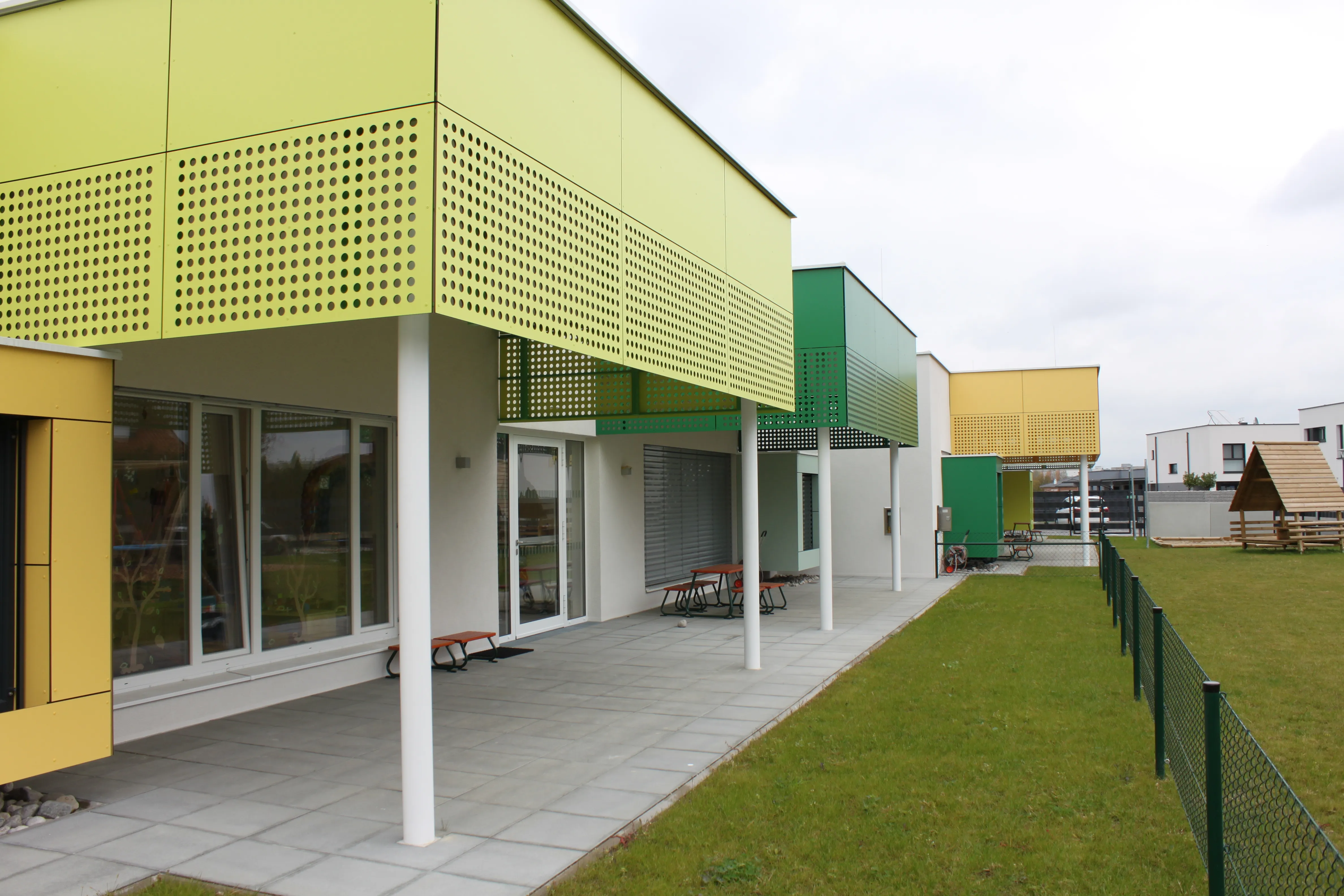 Modern single-story building with colorful sections in yellow and green, surrounded by grass and wood chips under a clear blue sky.Modern building with colorful, perforated paneling and large windows. Features a patio with benches and a grassy area in the foreground.